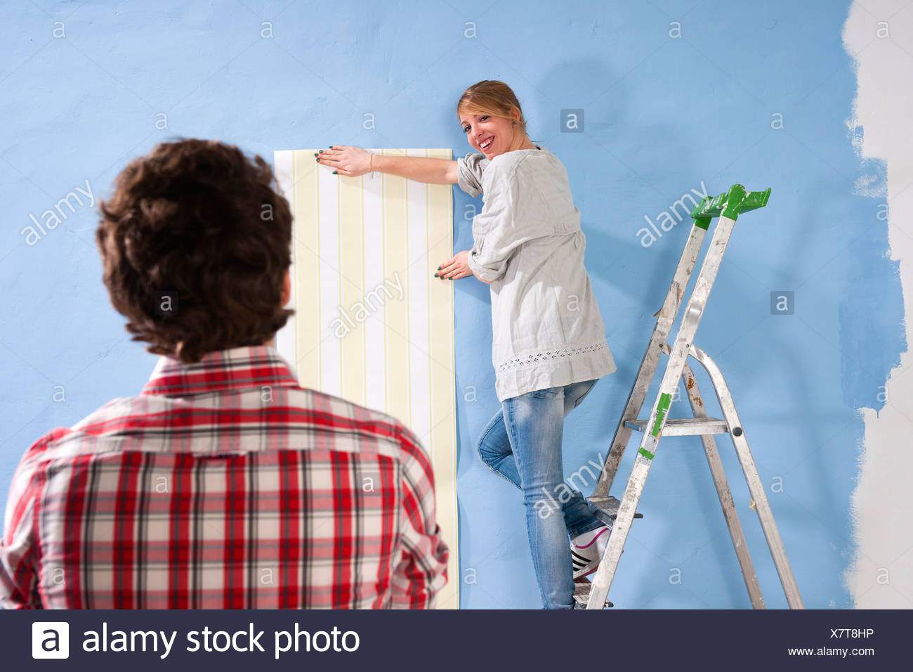 Young Couple Applying Wallpaper To A Wall Stock Photo