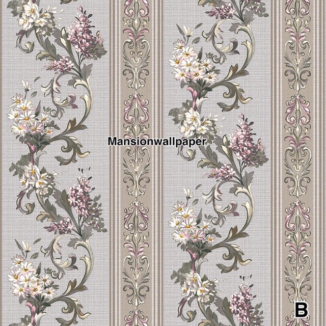 Wallpaper Dinding Korea Salur Garis Bunga Shabby Floral Mewah Ungu Cream