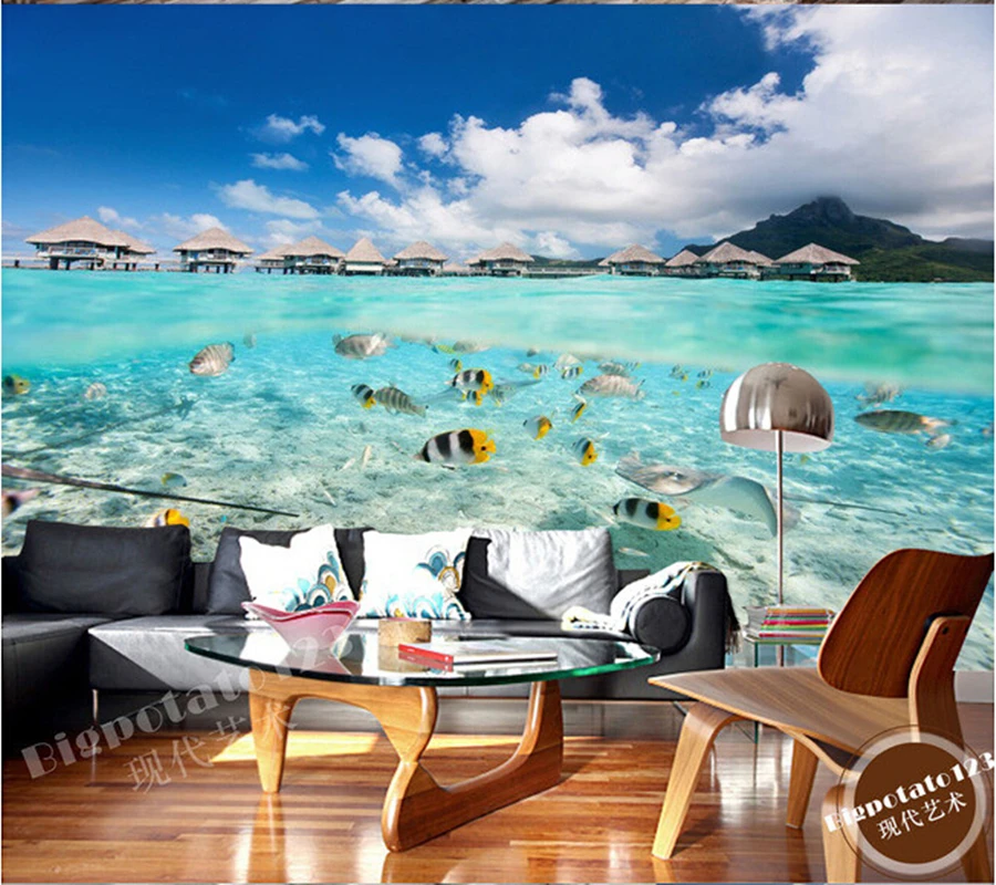 Us 10 73 63 Off Kustom 3d Mural Biru Langit Dan Awan Putih Oleh Laut Warna Warni Ikan Landscape Ruang Tamu Sofa Tv Dinding Kamar Tidur Dinding