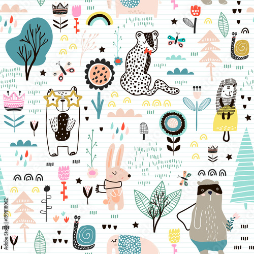 Seamless Childish Pattern With Fairy Flowers Bear Bunny