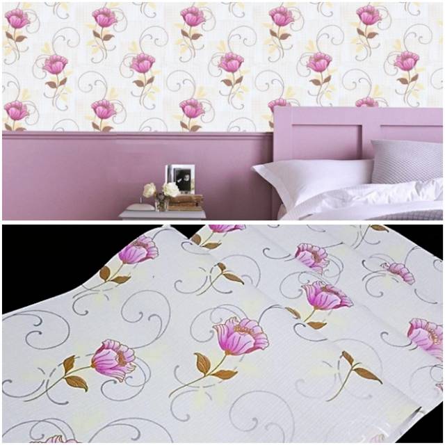 Wallpaper Dinding Murah Kamar Tidur Ruang Tamu Bunga Ungu Putih Cantik Indah Elegan Minimalis Bagus