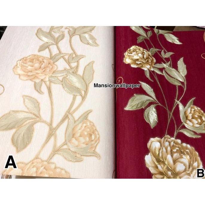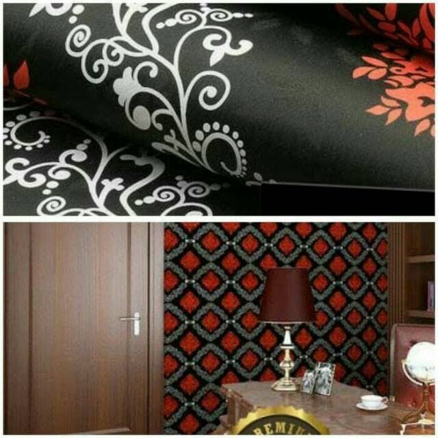 Ready Stock Wallpaper Dinding Bunga Sulur Ulir Merah Putih Hitam Emboss Diskon