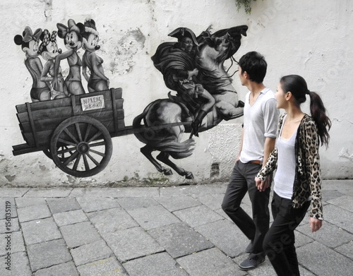 A Couple Walks Past A Wallpaper Depicting Italy S Prime