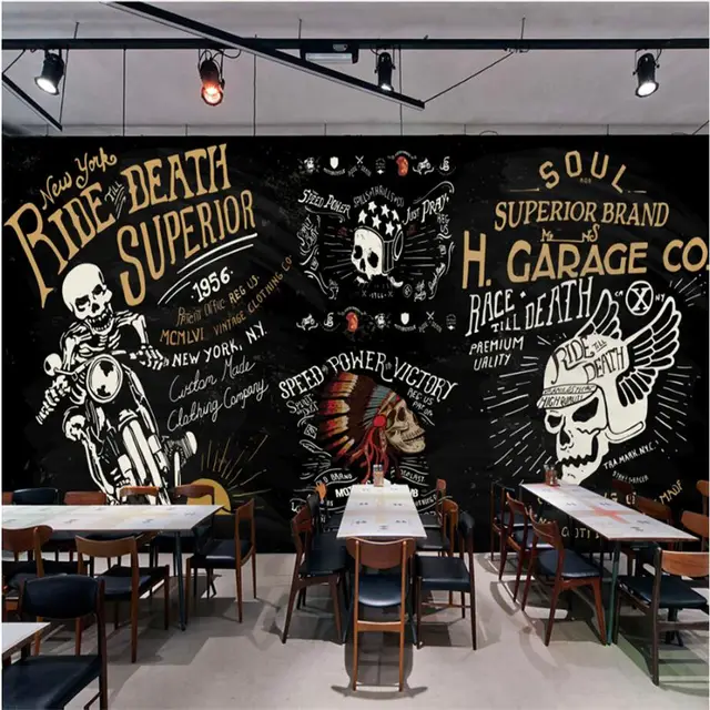 Beibehang Wallpaper Custom Ruang Tamu Kamar Tidur Eropa Dan Amerika Punk Sepeda Motor Tengkorak Kepala Bar Ktv Mural