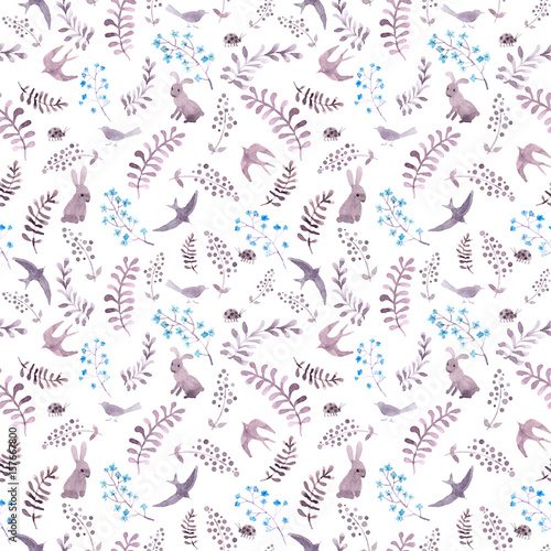 Rabbits Birds Ladybugs In Flowers Grass Seamless Cute