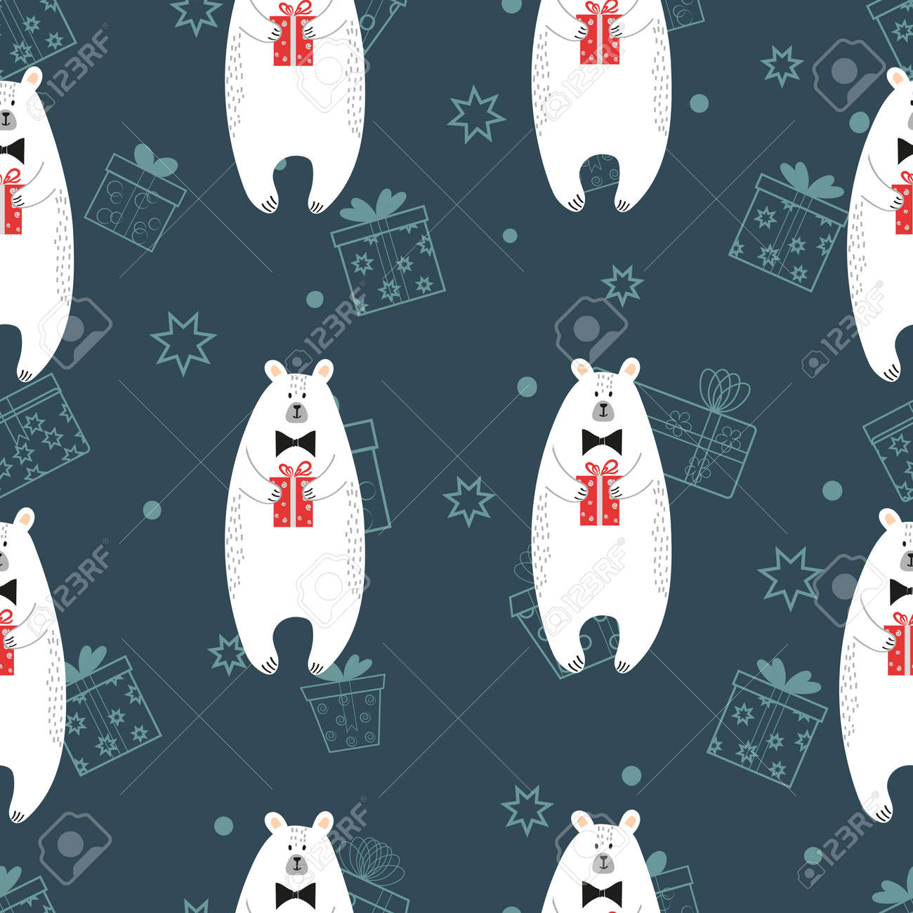 Seamless Pattern With Cute Cartoon Polar Bears Holding Gifts