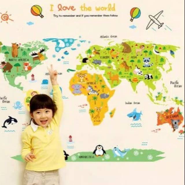 Stiker Dinding Wallpaper 60x90cm Motif Karakter Peta Dunia Edukasi Dekorasi Sekolah Dinding Anak
